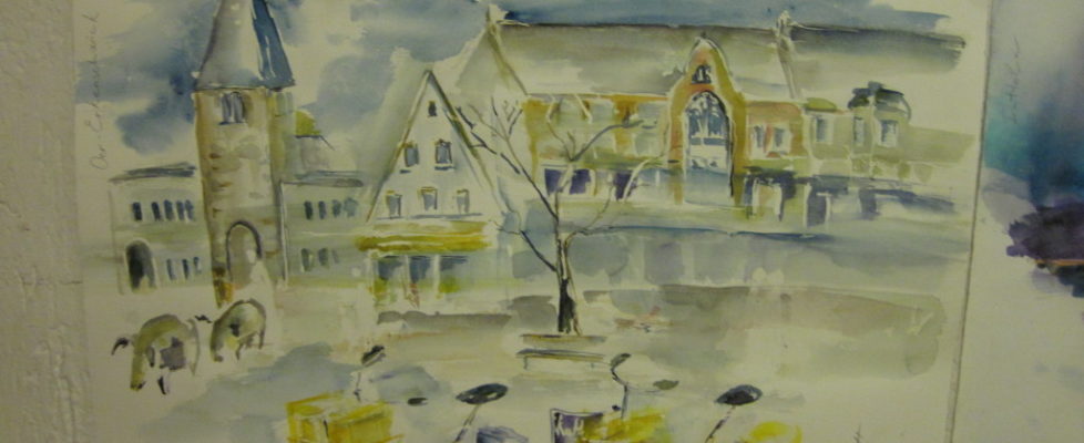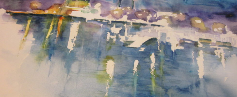 Zweite Station meiner Ruhrgebietsreise war Datteln. Datteln ist der größte Kanalknotenpunkt der Welt, daher habe ich natürlich auf den Kanal als Motiv für mein Datteln-Bild gewählt. Das Aquarell zeigt die Schleuse des Kanals bei Nacht.
